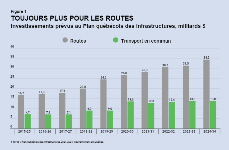 À chaque budget, le gouvernement du Québec dévoile ses grandes priorités en matière d’infrastructures publiques pour les dix prochaines années. Le Plan québécois des infrastructures (PQI) 2020-2030 se voulait le « plus ambitieux jamais présenté ». Le transport collectif était l’une des quatre priorités du gouvernement (avec la santé, l’éducation et la culture). Pour la première fois, on prévoyait « équilibrer » les investissements en transport en commun et ceux pour nos routes.